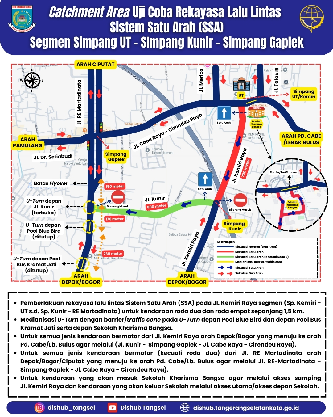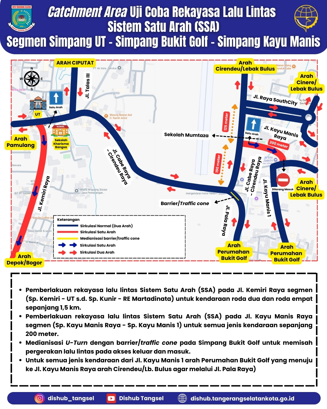 “Mulai 10 September, kami memberlakukan uji coba sistem satu arah pada Jalan Kemiri Raya dan Jalan Kunir, tepatnya segmen Simpang UT/Kemiri hingga Simpang Gaplek. Penerapan dilakukan pada dua waktu, yakni pukul 06.00–09.00 WIB dan pukul 15.00–19.00 WIB,” ujar Martha.