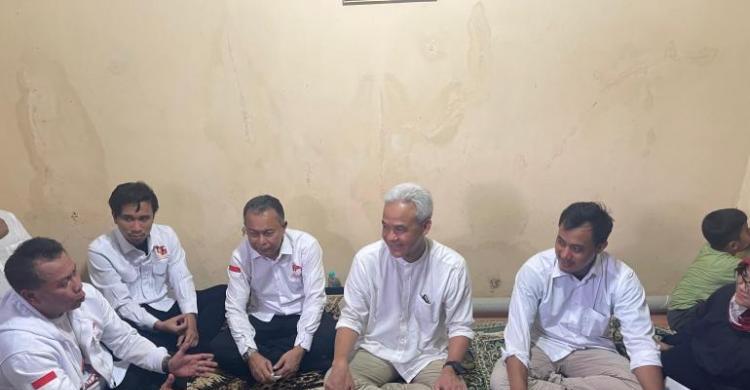 TANGERANG - Calon presiden (Capres) Ganjar Pranowo menyambangi rumah Putra Ajiyantoro, salah seorang buruh Konfederasi Serikat Pekerja Seluruh Indonesia (KSPSI) di Jalan Mustika, Tigaraksa, Kabupaten Tangerang pada Jumat (17/11/2023).