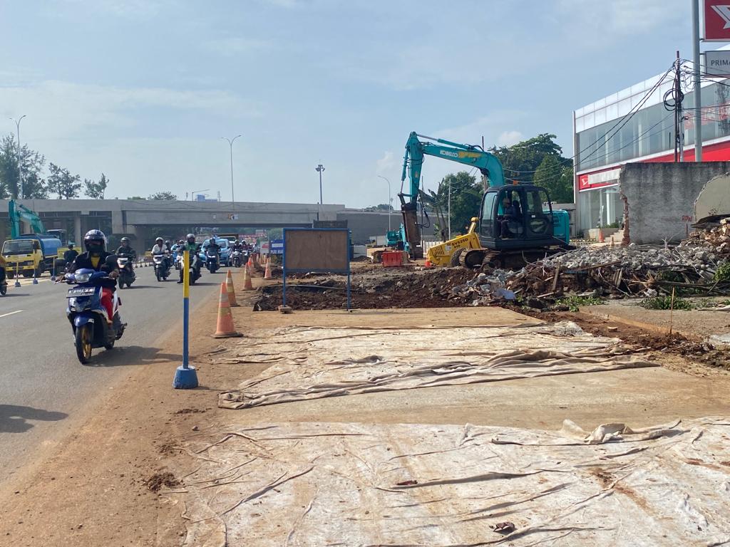Terlihat di lokasi, sejumlah alat berat sedang beroperasi mengerjakan pelebaran jalan di sisi kiri Jalan RE Martadinata dari arah Parung menuju Ciputat.