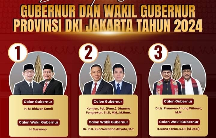 Debat ketiga Cagub dan Cawagub DKI Jakarta akan digelar di Hotel Sultan, Jakarta, Minggu (17/11/2024). Sama seperti debat sebelumnya, debat terakhir ini juga tetap diikuti oleh ketiga paslon. Yakni, paslon nomor urut 1 Ridwan Kamil-Suswono (RIDO), paslon nomor 2 Dharma Pongrekun-Kun Wardana (Dharma-Kun), dan paslon nomor 3 Pramono Anung-Rano Karno (Pram-Doel).